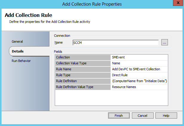 Next using the “Add Collection Rule” activity, we will add to the “SMEvent” collection, the computer received as a parameter .
